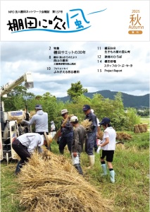1996年4月に第1号が発行された会報誌「棚田に吹く風」は、棚田ネットワークの会員や棚田ファン向けの棚田情報誌です。52号からはオールカラーになり、更に2010年の70号からは現在のB5版にリニューアルされました。多くの棚田関係者に支えられ2016年には記念の100号が発行されました。読みやすく、そして豊富な棚田情報を今後も読者の皆様にお届けして参ります。